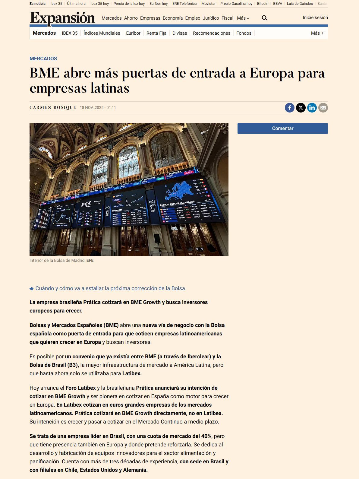 A BME, por sua vez, espera que a iniciativa da Prática inspire muitas outras empresas latino-americanas a seguir o mesmo caminho, acelerando o segmento de mercados de crescimento na Espanha.